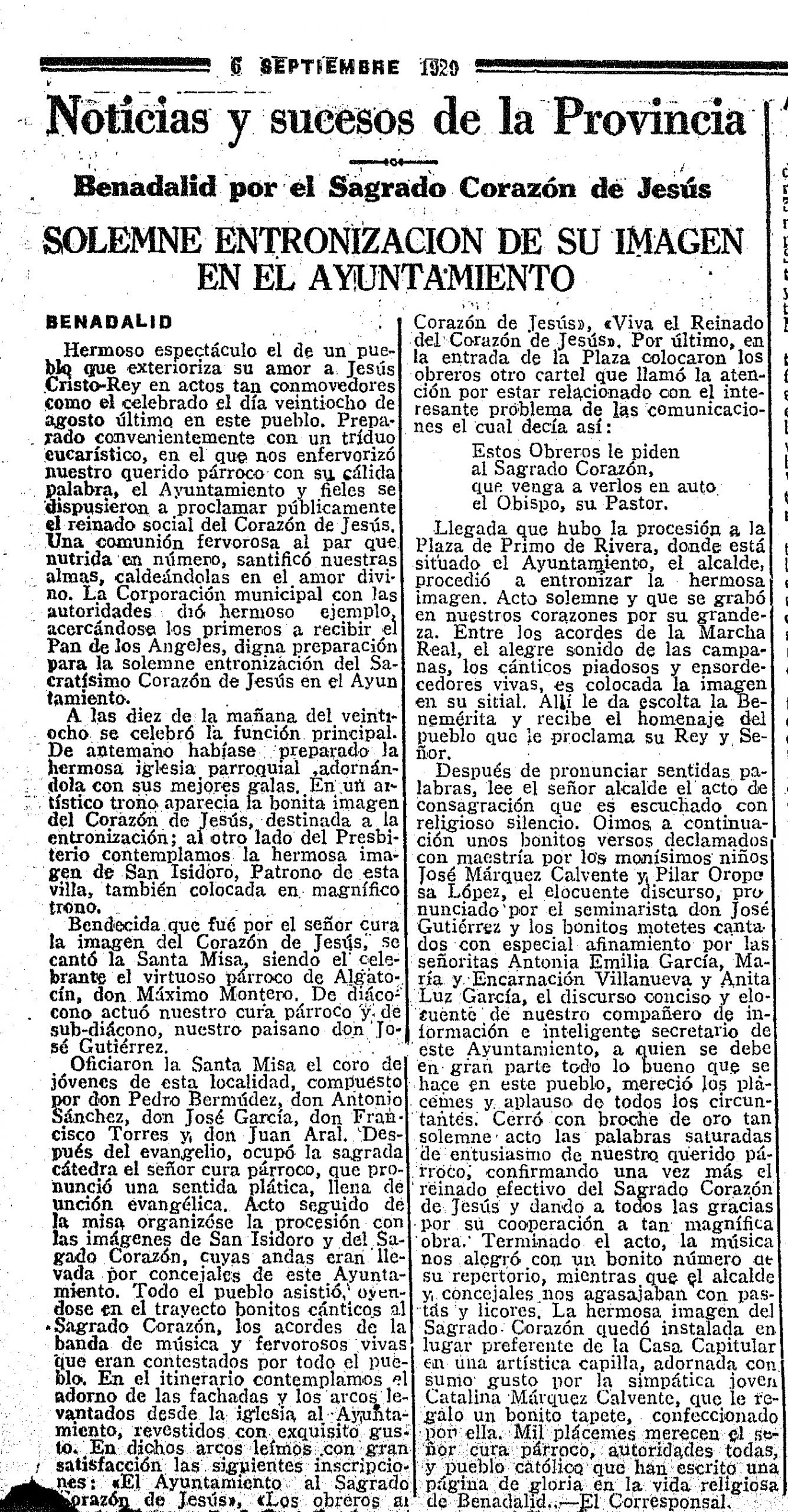 Después de pronunciar sentidas palabras, lee el señor alcalde el acto de consagración que es escuchado con religioso silencio. Oimos a continuación unos bonitos versos declamados con maestría por los monísimos niños José Márquez Calvente y Pilar Oropesa López, el elocuente discurso, pronunciado por el seminarista don José Gutiérrez y los bonitos motetes cantados con especial afinamiento por las señoritas Antonia Emilia García, María y Encarnación Villanueva y Anita Luz García, el discurso conciso y elocuente de nuestro compañero de información e inteligente secretario de este Ayuntamiento, a quien se debe en gran parte todo lo bueno que se hace en este pueblo, mereció los plácemes y aplauso de todos los circuntantes. Cerró con broche de oro tan solemne acto las palabras saturadas de entusiasmo de nuestro querido párroco, confirmando una vez más el reinado efectivo del Sagrado Corazón de Jesús y dando a todos las gracias por su cooperación a tan magnífica obra. Terminado el acto, la música nos alegró con un bonito número de su repertorio, mientras que el alcalde y concejales nos agasajaban con pastas y licores, La hermosa imagen del Sagrado Corazón quedó instalada en lugar preferente de la Casa Capitular en una artística capilla, adornada con sumo gusto por la simpática joven Catalina Márquez Calvente, que le regalo un bonito tapete, confeccionado por ella. Mil plácemes merecen el señor cura párroco, autoridades todas, y pueblo católico que han escrito una el página de gloria en la vida religiosa de Benadalid.- El Corresponsal