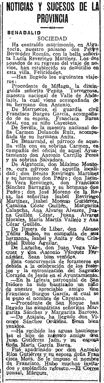 Ha contraído matrimonio, en Algatocín, nuestro paisano don Pedro Bermúdez Román, con la bella señorita Lucía Reveriego Martínez. Los desposados de su regreso del viaje de novios, han establecido su domicilio en esta villa. Felicidades.