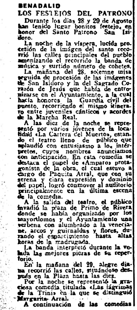 A las diez de la noche se representó por varios jóvenes de la localidad “La Cartera del Muerto”, estando el teatro lleno de público que aplaudió con entusiasmo a los intérpretes, cuyos nombres anunciamos con anticipación. En esta comedia se destaca el papel de “Amparo” protagonista de la obra, el cual estuvo a cargo de Paquita Arral, que con su serena y clara expresión y dominio del papel, logró conmover al auditorio principalmente en la última escena de la comedia.