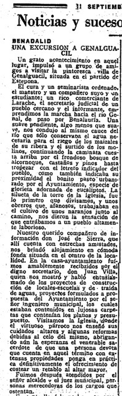 Nuestro querido compañero de información don José de Sierra, que allí cuenta con estrechas amistades, nos brindó alojamiento en cómoda fonda situada en el centro de la localidad. En la casa-ayuntamiento fuimos amablemente recibidos por el digno secretario, don Juan Villa, quien nos mostró y habló entusiasmado de los proyectos de construcción de locales-escuelas y de traída de aguas, proyectos formulados a propuesta del Ayuntamiento por el señor ingeniero municipal, los cuales estaban contenidos en lujosas carpetas que contenían los planos y presupuesto. Visitamos la Iglesia, donde el virtuoso párroco nos enseñó sus cuidados altares y algunas reformas debidas al celo del mismo, abrigando aún la esperanza el venerable sacerdote de que una persona devota que cuenta en aquel término con extensas propiedades ponga en práctica definitivamente el ofrecimiento de costear un retablo al altar mayor.