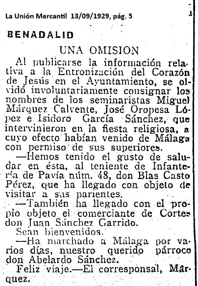 Al publicarse la información relativa a la Entronización del Corazón de Jesús en el Ayuntamiento, se olvidó involuntariamente consignar los nombres de los seminaristas Miguel Márquez Calvente, José Oropesa López e Isidoro García Sánchez, que intervinieron en la fiesta religiosa, a cuyo efecto habían venido de Málaga con permiso de sus superiores.
