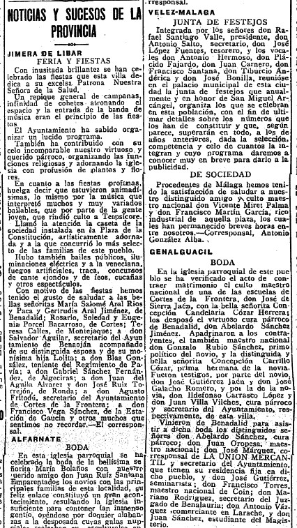 En la iglesia parroquial de este pueblo se ha verificado el acto de contraer matrimonio el culto maestro nacional de una de las escuelas de Cortes de la Frontera, don José de Sierra Jaén, con la bella señorita Concepción Candelaria Cózar Herrera; los desposó el virtuoso cura párroco de Benadalid, don Abelardo Sánchez Jiménez. Apadrinaron a los contrayentes, el también maestro nacional don Gonzalo Rubio Sánchez, primo político del novio, y la distinguida y bella señorita Concepción Carrillo Cózar, prima hermana de la novia. Fueron testigos, por parte del novio, don José Gutiérrez Jaén y don José Galacho Romero, y por la de la novia, don Ildefonso Carrasco López y don Juan Villa Vilches, cura párroco y secretario del Ayuntamiento, respectivamente, de esta villa.