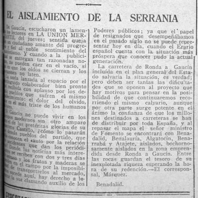 La carretera de Ronda a Gaucín incluída en el plan general del Estado salvaría la situación, es verdad; pero deben ser tantas las dificultades que se oponen al proyecto que hay motivos para pensar en la posibilidad de que continuaremos recorriendo el mismo calvario, aunque por otra parte surge potente en el ánimo la confianza de que los millones destinados a carreteras se han de distribuir por toda España, y al repasar el mapa el señor ministro de Fomento se encontrará con Benadalid, Benalauría, Algatocín, Benarrabá y Atajete, aislados, bochornosamente aislados en la zona emprendida desde Ronda a Gaucín. Entre las rocas guardan el tesoro de su inexplotada riqueza esperando la hora de su redención.- El corresponsal, Márquez.
