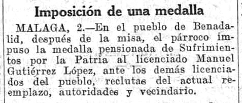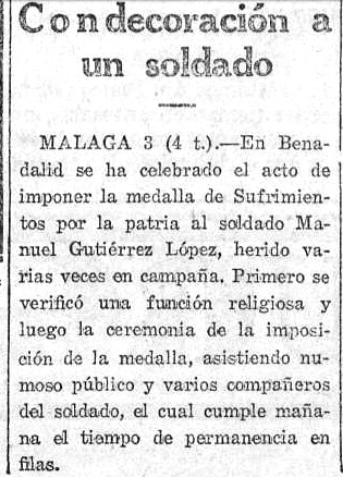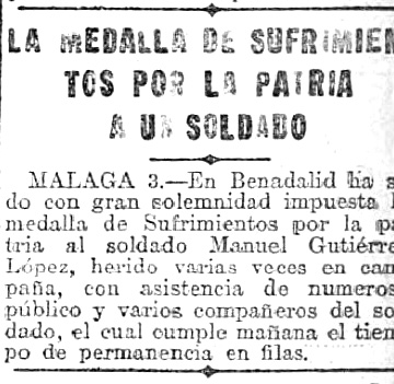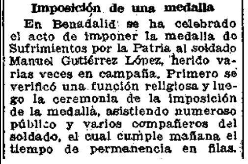 En Benadalid se ha celebrado el acto de imponer la medalla de Sufrimientos por la Patria al soldado Manuel Gutiérrez López, herido varias veces en campaña. Primero se verificó una función religiosa y luego la ceremonia de la imposición de la medalla, asistiendo numeroso público y varios compañeros del soldado, el cual cumple mañana el tiempo de permanencia en filas.