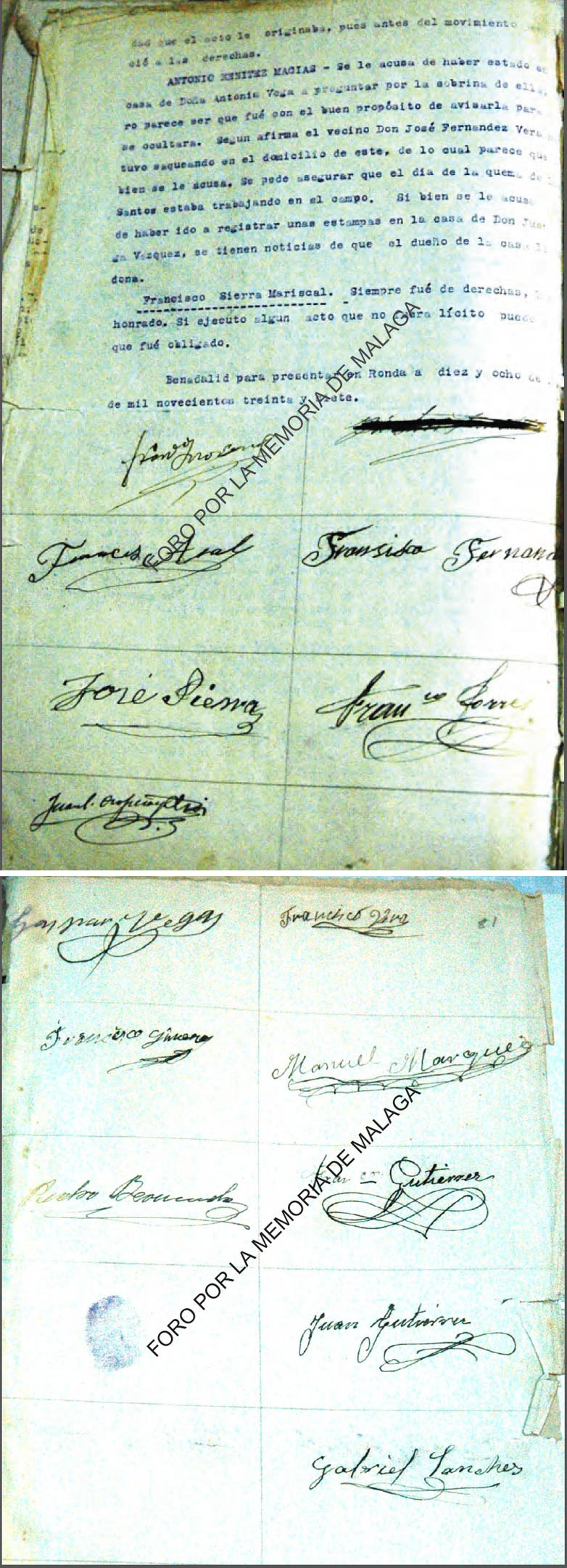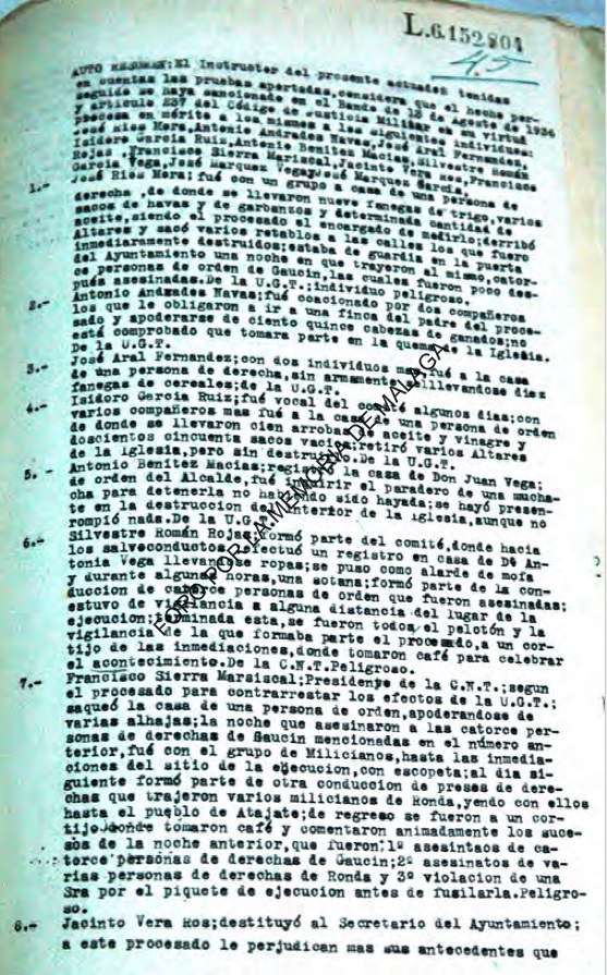 7.- Francisco Sierra Marsiscal; Presidente de la CNT; según el procesado para contrarrestar los efectos de la UGT; saqueó la casa de una persona de orden, apoderandose de varias alhajas; la noche que asesinaron a las catorce personas de derechas de Gaucin mencionadas en el número anterior, fue con el grupo de Milicianos, hasta las inmediaciones del sitio de la ejecucion, con escopeta; al dia siguiente formó parte de otra conduccion de presos de derechas que trajeron varios milicianos de Ronda, yendo con ellos hasta el pueblo de Atajate; de regreso se fueron a un cortijo donde tomaron café y comentaron animadamente los sucesos de la noche anterior, que fueron: 1º asesintaos de catorce personas de derechas de Gaucin; 2º asesinatos de varias personas de derechas de Ronda y 3º violacion de una Sra por el piquete de ejecucion antes de fusilarla. Peligroso.