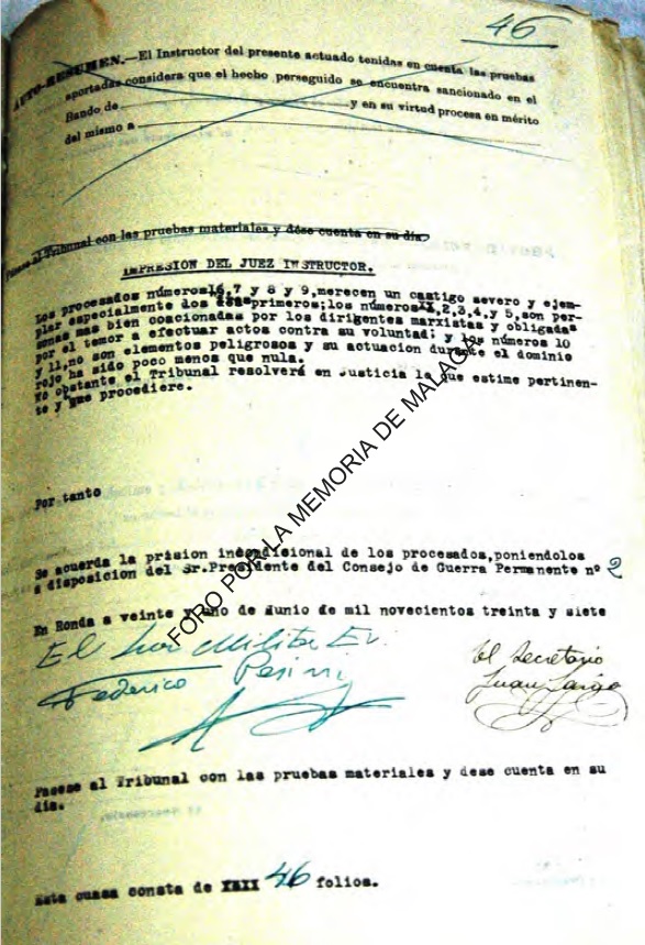 En el orden cronológico, a la fase de instrucción del consejo de guerra sumarísimo y de urgencia, efectuada por el cabo Ceferino Borrego en Benadalid y luego por el teniente Federico Pessini en Ronda, sigue un escrito dirigido a este último por la gente de orden del pueblo (no toda) a favor de los reos (no todos), y a continuación el auto o dictamen del juez instructor.