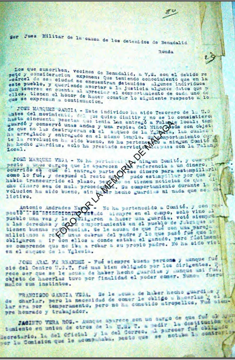 Los que suscriben, vecinos de Benadalid, a V.S. con el debido respeto y consideracion exponen: Que teniendo conocimiento que en la cárcel de esa ciudad se encuentran detenidos algunos individuos (de) este pueblo, y queriendo aportar a la justicia algunos datos que p(ue)dan tenerse en cuenta al apreciar el comportamiento de cada uno de ellos, tienen el honor de hacer constar lo siguiente respecto a lo(s) que se expresan a continuacion.