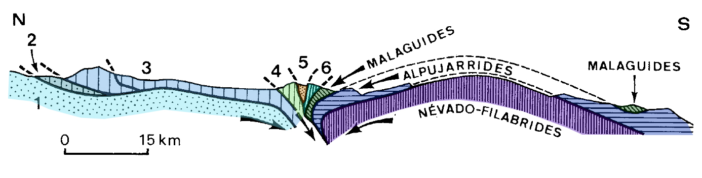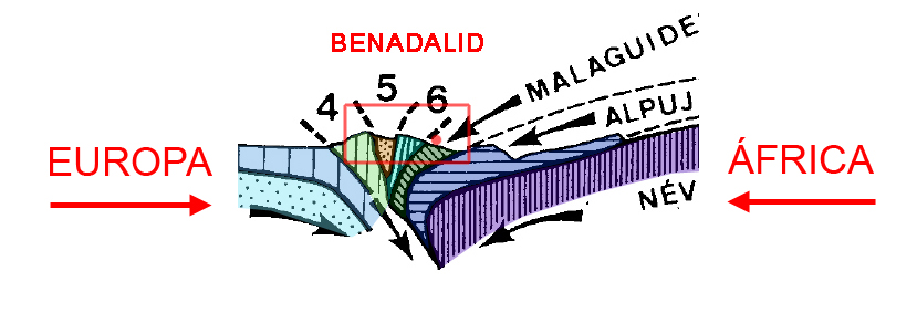 - Las calizas claras de la Sierra (6), más el terreno de bujeos marrón (5), que es de edad posterior, debieron de formarse en una cuenca entre los dos continentes.