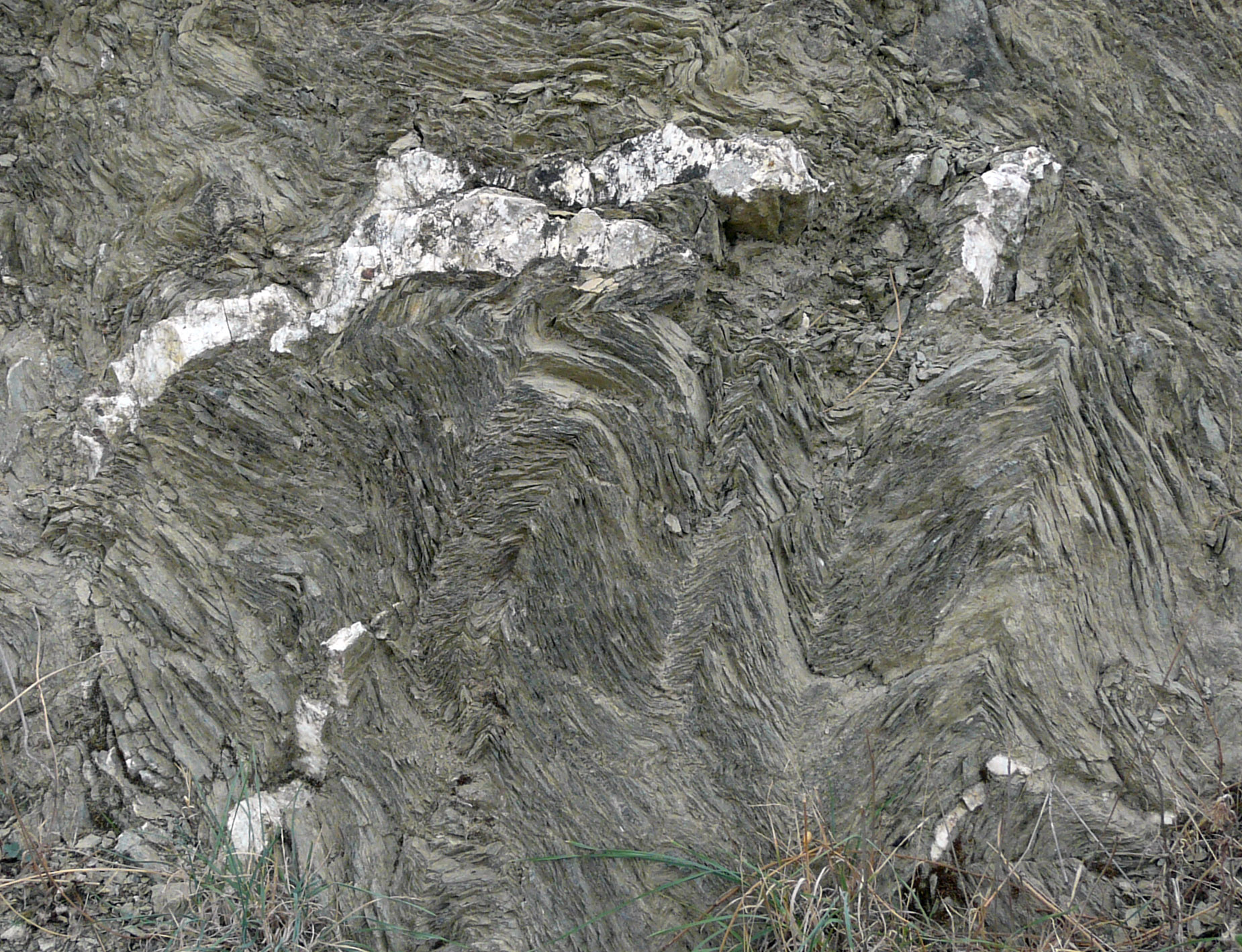 Estas pizarras son de color azul oscuro, aunque la intemperie las vuelve gris claro con tonos oliva o celeste. Sus láminas suelen tener muchos repliegues, y a veces presentan fracturas, también plegadas, rellenas de un material cuarzoso. Esto se ve a simple vista, y en la intimidad pueden mostrar pequeños cristales de pirita.