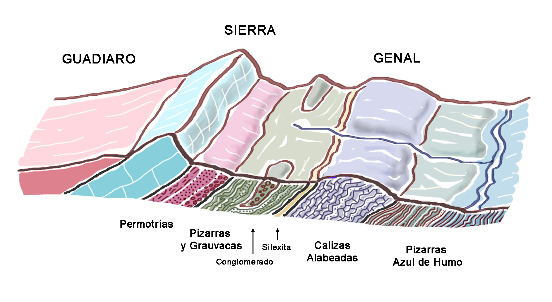 Como quedó dicho, las rocas que abundan en esta falda son: pizarras, areniscas y calizas; a las que hay que añadir algunos lentejones de conglomerado y niveles de sílex, para completar de momento el cuadro. La siguiente figura de la estratigrafía de esta vertiente es solo un resumen, carece de exactitud: