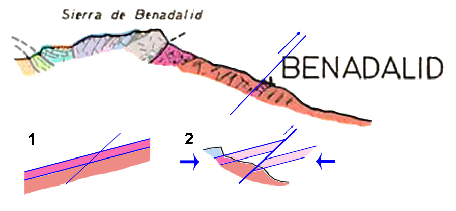 El mecanismo es parecido al propuesto para explicar el salto de intensidad en los materiales metamórficos: una falla debida a fuerzas de compresión, es decir una falla inversa que ha montado un bloque sobre otro. Después, se ve que la erosión ha eliminado buena parte del diseño.