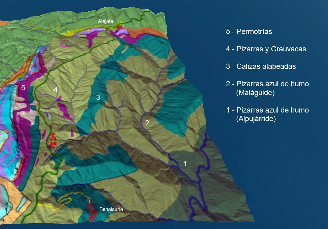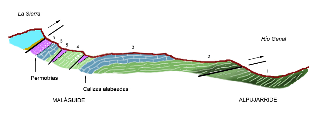 En el tramo más bajo, el de las Pizarras Azul de Humo, queda clara la distinción entre las del Alpujárride (1) y las del Maláguide (2). También se puede apreciar la repetición de los afloramientos de las Calizas Alabeadas (3) y del Permotrías (5), unos cerca de la Sierra y otros algo más lejos.