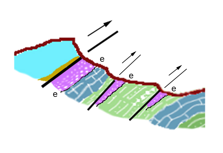 Fijémonos ahora en la base o muro de la serie roja o podemita. Es la línea ee del dibujo, según la cual el Permotrías yace indistintamente sobre cualquier tramo anterior, sin obrar fallas por medio. Se trata de una discordancia erosiva. Las capas precedentes se han formado en el fondo del océano, pero estas son de ambiente continental. Como mínimo, este cambio indica una emersión de los sedimentos marinos, con la consiguiente etapa de erosión, y el posterior depósito de los materiales permotriásicos por encima del nivel del mar. Como mínimo digo, pues hay datos que apuntan a una fase de plegamiento de las pizarras, grauvacas y calizas antes de su levantamiento y erosión.