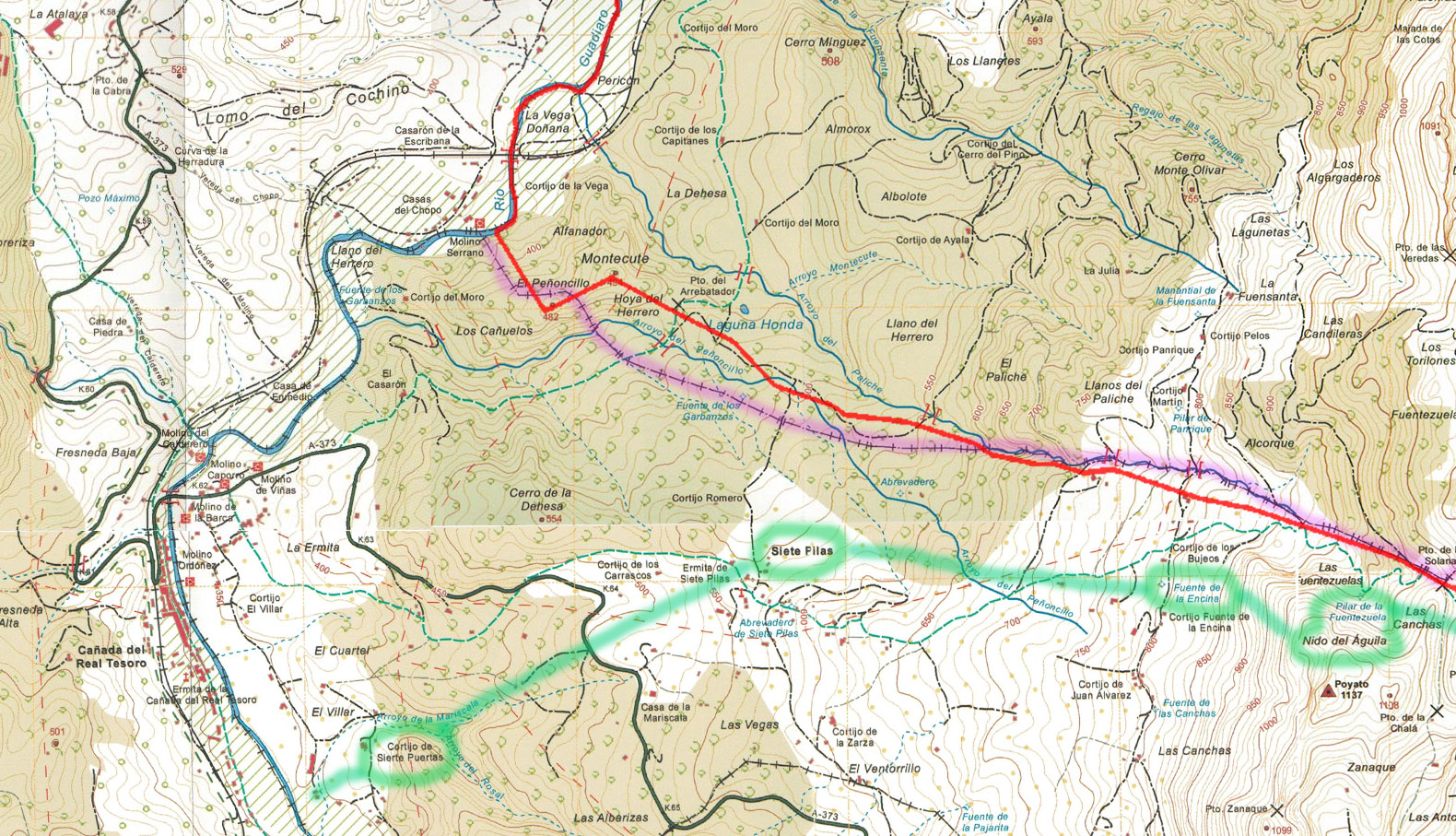 El molino de las Alcobainas no aparece en ningún plano, pero es de suponer que quedaría al sur de la actual Estación de Cortes, enfrente del cortijo de Siete Puertas. Las pilas de Calabrina son las conocidas Siete Pilas. De las eras de Faja Retama (curioso nombre) no queda rastro en los mapas, pero sí de la fuente de la Encina y del peñón (o nido) del Águila. El pilar de la Fuentezuela aún subsiste, cerca del puerto que da vista al Genal, donde es razonable ubicar una Cruz del Campo. A partir de aquí la fuente de las Calenturas, la Horadada (Horahá, Horá), la Rata, la Mayordoma…, marcan el límite propuesto por Benadalid. Quedan por situar el llano del Algarrobo y el cancho Azul.