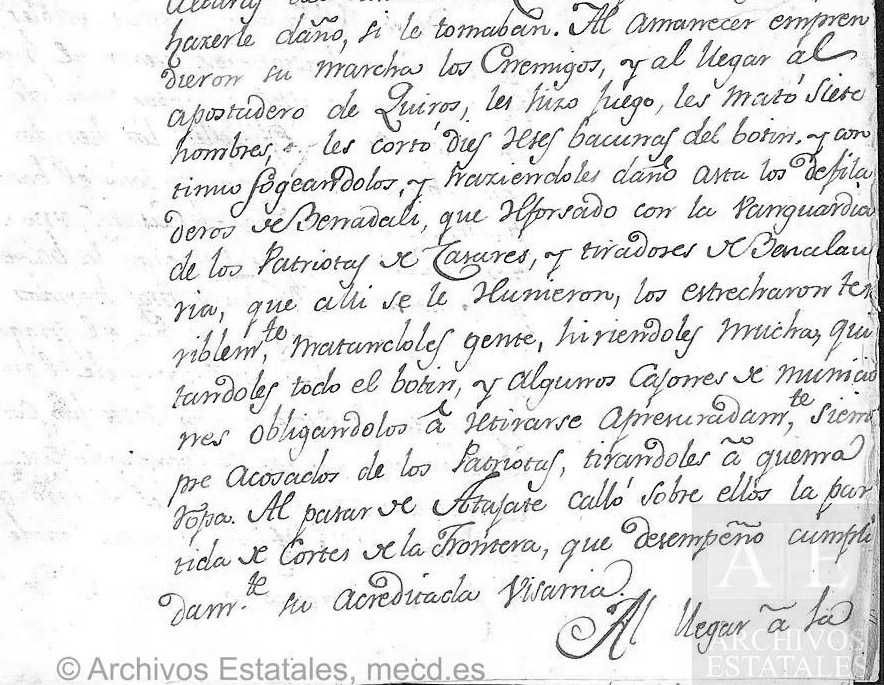 Mientras esta Tropa le divertia p(o)r el frente, el Presb(iter)o D(o)n Fern(an)do Quiros, que se hallaba con su partida en la sierra de Casares notisioso del acaesido, vajó en diligencia al rio Genal, le pasa p(o)r mas arriba del Camino Real, sube à la cercania del Pueblo y se situa sobre su flanco derecho, con cuia colocasion abrigó la evasion del vecindario, le impusó, y retirandose sobre las alturas del Camino de Ronda apostó su Gente p(ar)a hacerle daño, si le tomaban. Al amanecer emprendieron su marcha los Enemigos, y al llegar al apostadero de Quiros, les hizo fuego, les mató siete hombres, y les cortó dies reses bacunas del botin, y continuo fogeandolos, y haziendoles daño asta los desfiladeros de Benadali, que reforsado con la vanguardia de los Patriotas de Casares, y tiradores de Benalauria, que alli se le reunieron, los estrecharon terriblem(en)te, matandoles gente, hiriendoles mucha, quitandoles todo el botin, y algunos cajones de municiones obligandolos à retirarse apresuradam(en)te, siempre acosados de los Patriotas, tirandoles à quema ropa. Al pasar de Atajate calló sobre ellos la partida de Cortes de la Frontera, que desempeñó cumplidam(en)te su acreditada visarria.