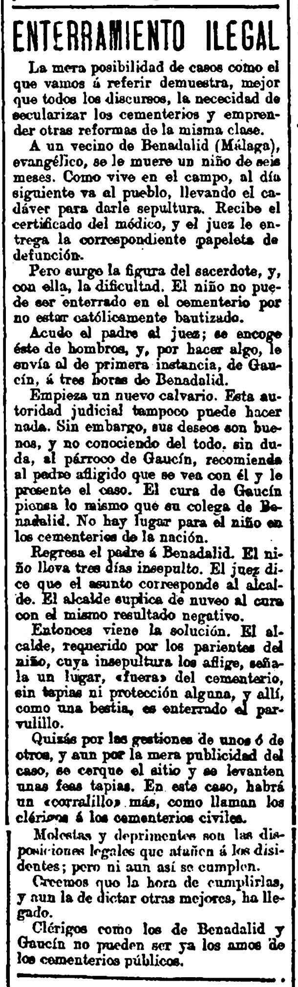 “A un vecino de Benadalid (Málaga), evangélico, se le muere un niño de seis meses… (sigue el mismo texto de El Liberal, con erratas corregidas).