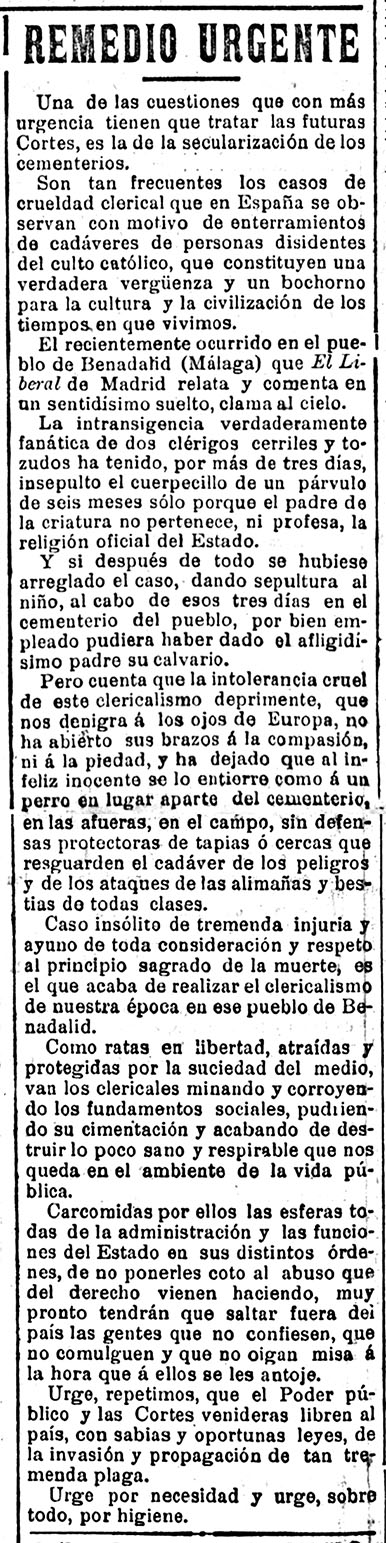 Son tan frecuentes los casos de crueldad clerical que en España se observan con motivo de enterramientos de cadáveres de personas disidentes del culto católico, que constituyen una verdadera vergüenza y un bochorno para la cultura y la civilización de los tiempos en que vivimos.